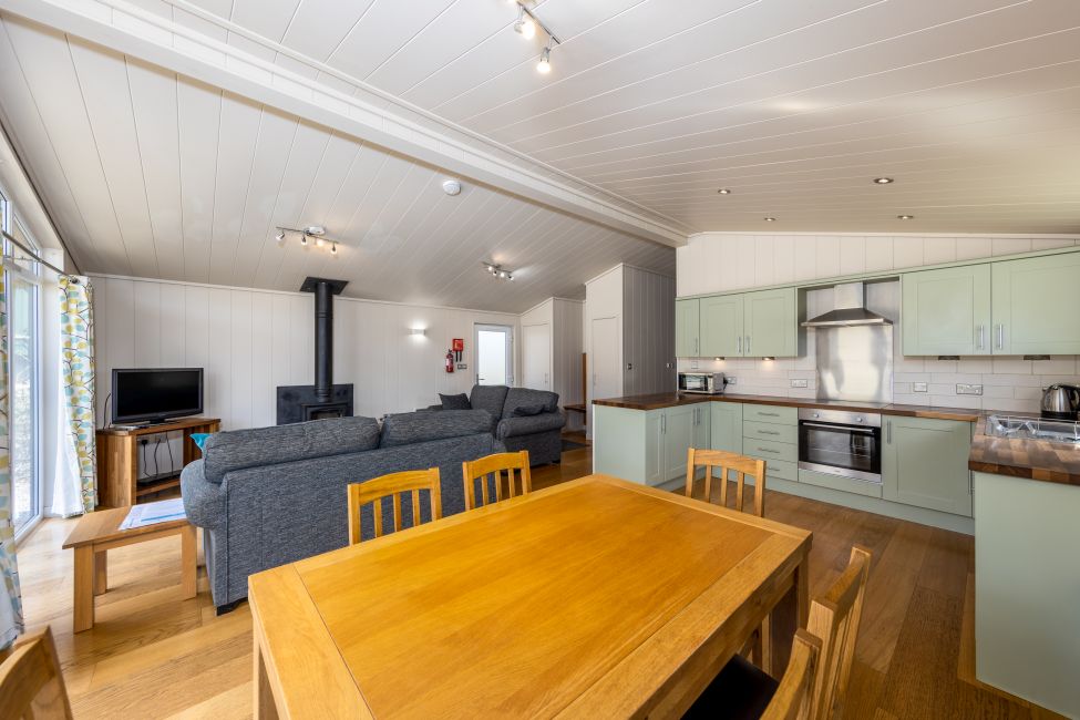 It is a little bigger than the other lodges with large decked areas and fantastic views of the surrounding fells. It has an open plan living room and kitchen, the living room has two large sofa's, woodburning stove, Freesat HDTV and large picture windows looking up the fell. The kitchen is lovely with Iroko hardwood worktops, a ceramic hob, built-in fan oven and grill, microwave, dishwasher, fridge, full-size freezer and all the other usual kitchen equipment. There is a bathroom and a shower room both with underfloor heating, 2 king-sized double rooms and a bunk room with built-in full-size beds. The master bedroom has french windows leading out onto the decking. Heating is by a combination of electric panel heaters, underfloor heating, and a wood-burning stove. Free WiFi is available in the lodge.